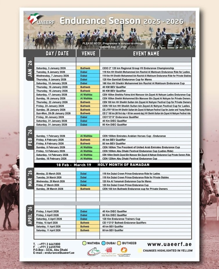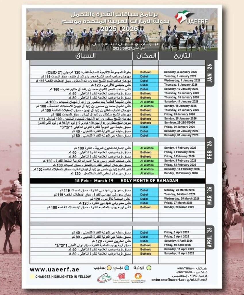 قام إتحاد الإمارات للفروسية والسباق بالإعلان عن برنامج سباقات القدرة والتحمل للموسم الجديد 2025-2026 والذي يحتوي على العديد من الفعاليات الدولية والمحلية المميزة في كلا من قرية الإمارات العالمية للقدرة ،ونادي دبي للفروسية ،وقرية بوذيب العالمية للقدرة .