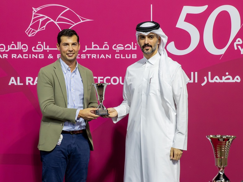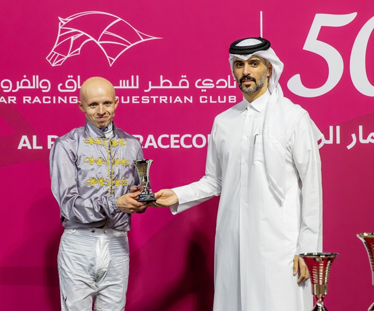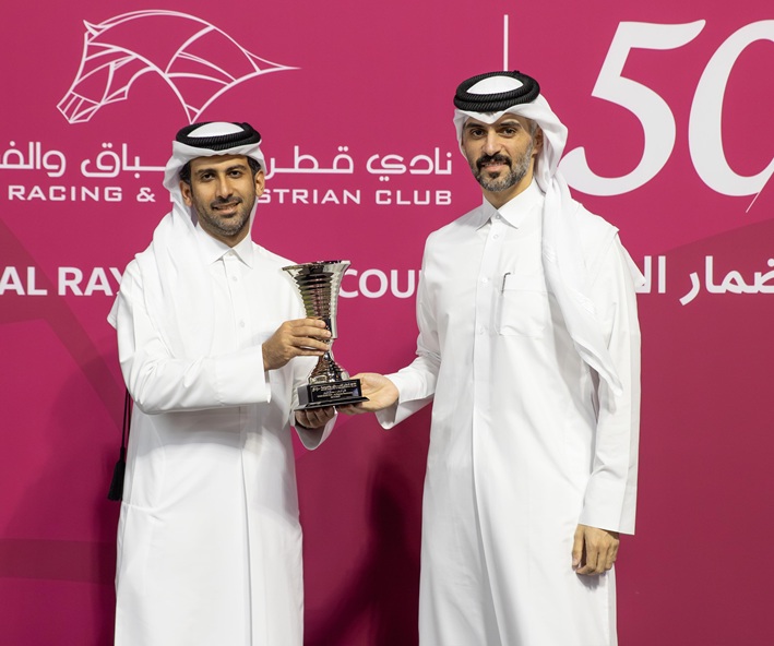 وتوج الفائزين السيد راشد سعيد عضيبه، رئيس قسم تنظيم السباقات بنادي قطر للسباق والفروسية.