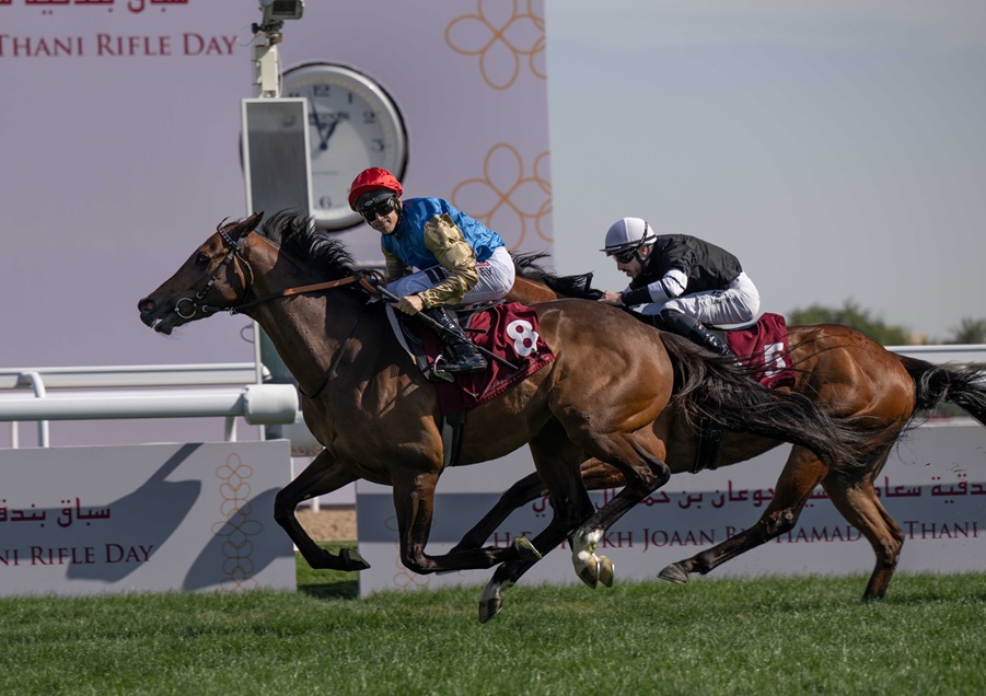 سرعان ما عاد وذنان ريسنغ إلى منصة التتويج مؤكداً تربعه على قمة السباق اليوم، وذلك بالحصول على صدارة الشوط الثامن على جائزة سعادة الشيخ جوعان بن حمد آل ثاني للخيل العربية الأصيلة، 4 سنوات، 1750م، حيث قام سعادة السفير مشعل بن علي العطية، سفير دولة قطر لدى البوسنة والهرسك، بتتويج الفائزين بالجائزة، وتسلم الجائزة الشيخ عبدالله بن تميم آل ثاني، نيابة عن وذنان ريسنغ، مالك الجواد الفائز قداح (أزادي × حامية العز)، الذي أحرز فوزه الأول بانتصار كبير وأسلوب شديد التميز في خامس مشاركاته، وبعدما جاء وصيفاً في 3 مشاركات سابقة، فمع انطلاقه من البوابة الأولى ظل المهر الأزرق مستقراً في الخلف في المراحل الأولى والوسطى من الشوط متتبعاً مجموعة المقدمة ثم تقدم في المسار المستقيم الأخير، وعلى الرغم من الفارق بينه وبينهم فقد أظهر سرعة فائقة في آخر 100م ليصل للمقدمة ويحتفظ بها محققاً الفوز بفارق ربع طول، ومسجلاً الفوز السادس في السباق لكل من وذنان ريسنغ والمدرب ألبان دو ميول والخامس للخيال جيمس دويل.