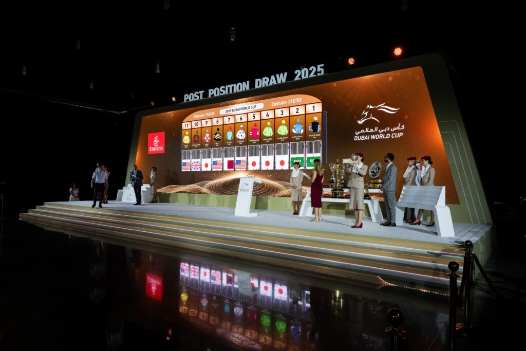 ويتم سحب القرعة لشوط كأس دبي العالمي، و4 أشواط أخرى هي “القوز سبرنت” لمسافة 1200 متر “الفئة الأولى”، ودبي جولدن شاهين لمسافة 1200 متر “الفئة الأولى”، ودبي تيرف لمسافة 1800 متر “الفئة الأولى”، ودبي شيماء كلاسيك لمسافة 2410 أمتار “الفئة الأولى”.