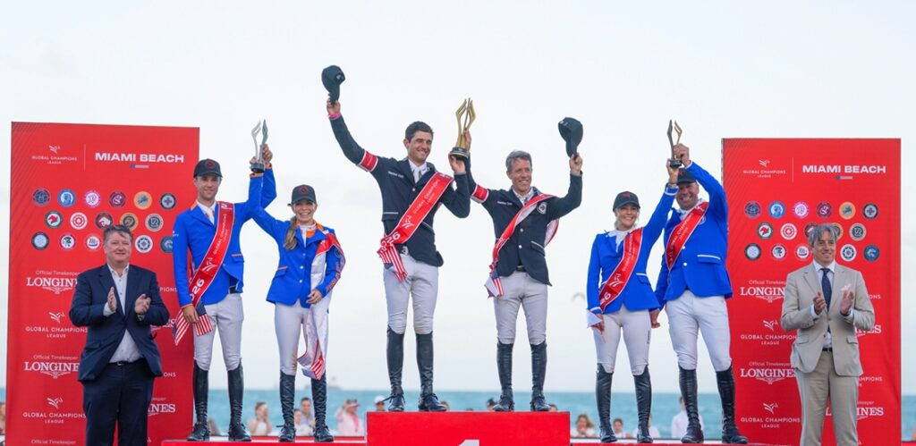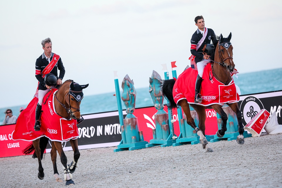 ومنذ الجولة الأولى ظهر حضور فريق مدريد إن موشن للمنافسة بقوة في بداية موسم 2026 بتقديم أداء متماسك واستراتيجي وخال من الأخطاء في النهاية، ووضع الفريق معيارا جامعا بين الخبرة وقوة الخيول والدقة، ليحصد أول فوز في الموسم على رمال ميامي ويحصل على العلامة الكاملة من النقاط في المرحلة الأولى بزمن قدره 145.25 ثانية دون أخطاء وحاز جائزة مالية قدرها 26 ألف يورو من بين 200 ألف يورو جوائز الجولة ،ومثل الفريق الفرسان مايكل فان دير فلوتين على الجوادين ” بيوفيل ” و”كواستور” ،و فيكتور بيتيندورف على الجواد ” آتشوم” ،وجاك ماتيكار على الجواد ” إزارا ،وحل ثانيا فريق فالكنسوارد يونايتد بزمن قدره 141.55 ثانية بأربعة أخطاء وجائزة ماليو قدرها 22 ألف يورو ،ومثله كلا من الفارسة إدوينا توبس ألكسندر على الجوادان “سيدلو” و”فيلو كاستلفايد”،وجيل توماس على الجوادان “كيارا” ،و”كاليستا” ،وحل ثالثا في مفاجأة كبيرة بسبب أول تمثيل له في البطولة فريق فراعنة القاهرة من مصر ،بزمن قدره 150 .35 ثانية بأربعة أخطاء ،وجائزة مالية 18 ألف يورو ومثل الفريق الفرسان نايل نصار على الجواد “أورفيا إتش كيو ،وانايليس فورسيلمانس على الجوادان “كيلتون” و”تريزيجيت” ،وبيم مالدير على الجواد “فيكتور زد “.