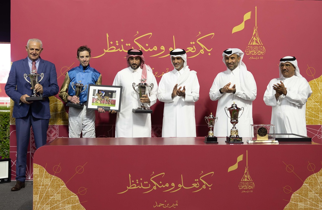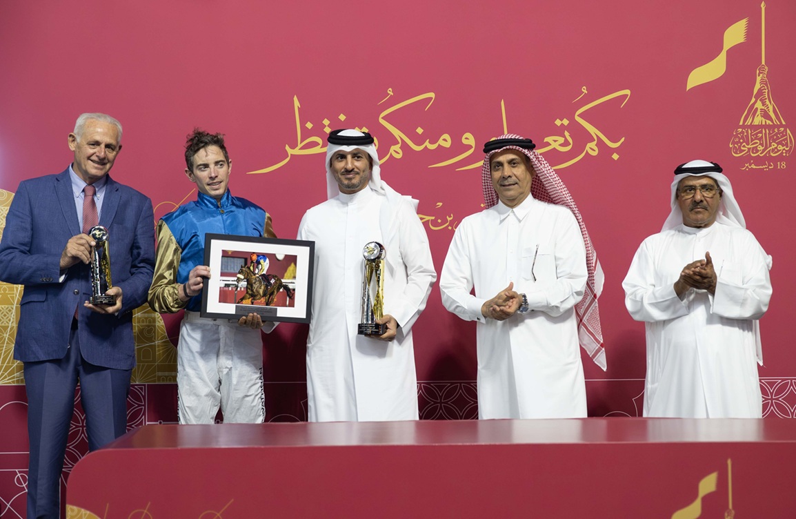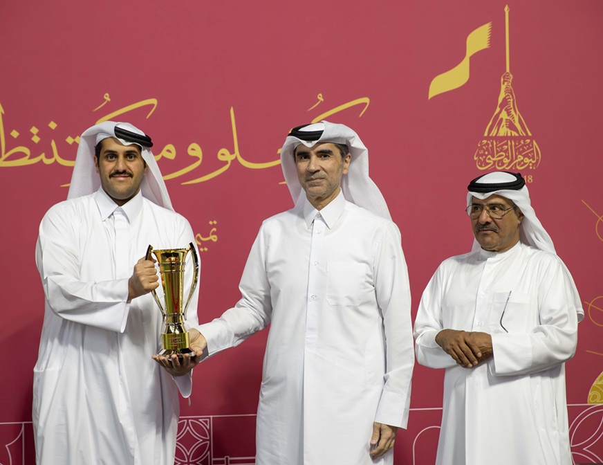 عقب نهاية الشوط الثامن توج سعادة الشيخ حمد بن خليفة بن أحمد آل ثاني، وزير الرياضة والشباب، الفائزين بجائزة اليوم الوطني ، وتسلم الجائزة السيد علي بن يوسف الكبيسي نيابة عن وذنان ريسنغ مالك الفرس الفائزة ” آر بي ماري ليلة” التي أضافت لهم ولمدربها ألبان دو ميول الفوز الثالث على التوالي في السباق، بعد أن أظهرت الفرس ذات الخمس سنوات، ابنة “المرتجز”، قدرة مذهلة على زيادة سرعتها في المسار المستقيم الأخير، فابتعدت تماماً في المقدمة محرزة انتصاراً من الفئة الثانية للخيل العربية الأصيلة على مسافة 2000م وبفارق هائل بلغ 6 أطوال كاملة بقيادة الخيال جيمس دويل الذي أضاف أيضاً فوزه الثاني على التوالي في السباق، كما احتفظ الثلاثي المالك والمدرب والخيال بنفس الجائزة للعام الثاني على التوالي بعد فوزهم بها العام الماضي مع الجواد “جبلة”.