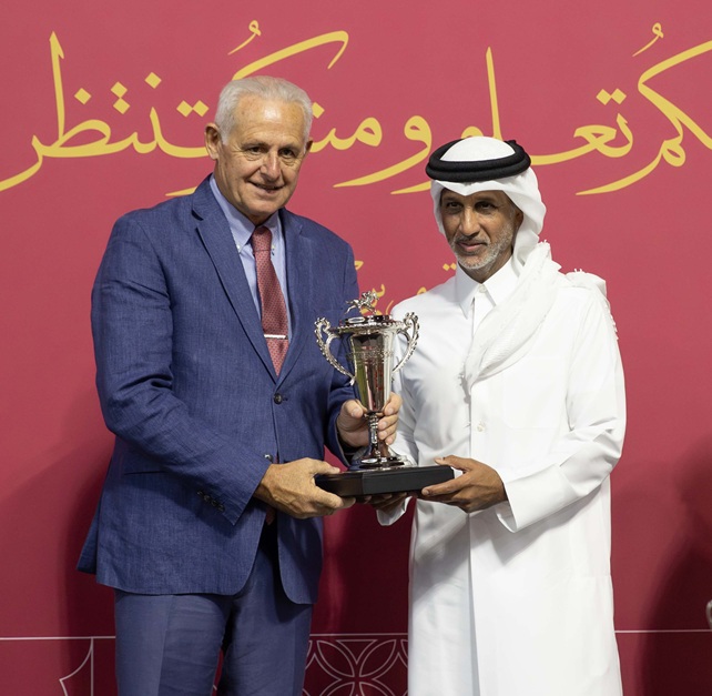 في الشوط الرابع المخصص للخيل المهجنة الأصيلة عمر 3 سنوات فما فوق لمسافة 1200م، توج سعادة الشيخ محمد بن فالح آل ثاني المهندس أسامة عمر إسماعيل الدفع، مالك ومدرب الجواد “تاكسيوالا” (هولي رومان إمبرور × إتس ترو) بكأس الصقر، بعدما أثبت “تاكسيوالا” استمرار تفوقه بالاحتفاظ بالكأس للسنة الثانية على التوالي وللمرة الثالثة في مسيرته، حيث ظل يتتبع شاغلي المقدمة ثم تقدم بقوة في آخر 200م ليسبق الجميع ويحرز الفوز بفارق طول ونصف بقيادة الخيال لوكاس دولوزييه، ليواصل الجواد المخضرم ذو الثمان سنوات أداءه المتميز هذا الموسم بإحراز فوزه الثاني على التوالي في ثالث مشاركاته، ويعزز رصيده بالفوز رقم 21.