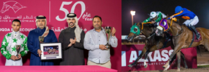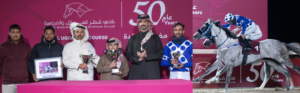 مضمار – الدوحة – نادي قطر للسباق والفروسية تصوير جهيم قام السيد راشد سعيد عضيبه، رئيس قسم تنظيم السباقات بنادي قطر للسباق والفروسية، بتتويج الفائزين بكأس العريش الذي أقيم اليوم الخميس 22 ين