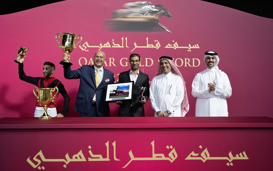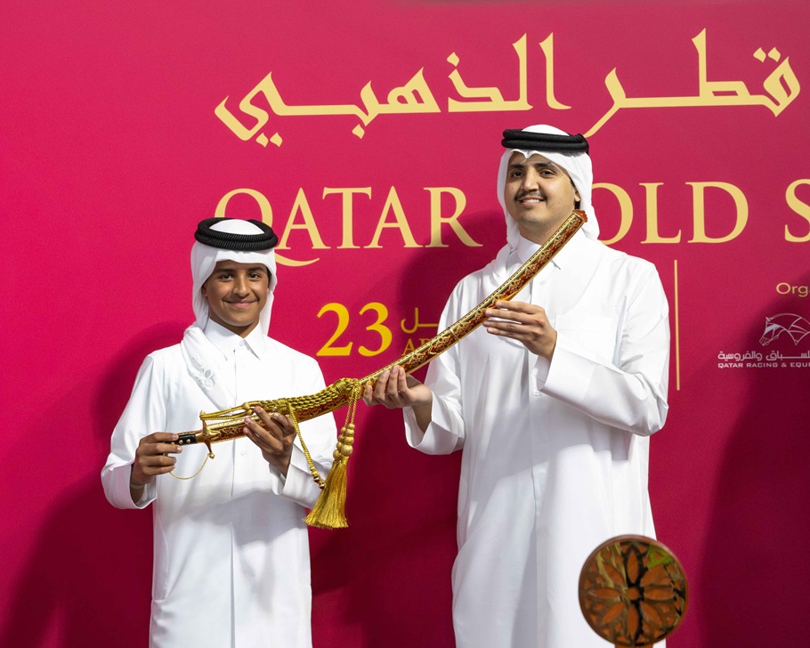 Under the patronage of HE Sheikh Thani bin Hamad Al Thani, the Qatar Gold Sword and Trophy meeting was staged at QREC Al Rayyan Racecourse on Thursday, 23 April. Following the day’s final race, HE Sheikh Thani bin Hamad Al Thani presented the Qatar Gold Sword, which was received by HE Sheikh Jassim bin Tamim Al Thani after the Wathnan Racing-owned Chdia (Al Mourtajez x Rkaya) captured the day’s feature and concluding race, the Gr1 PA Qatar Gold Sword.